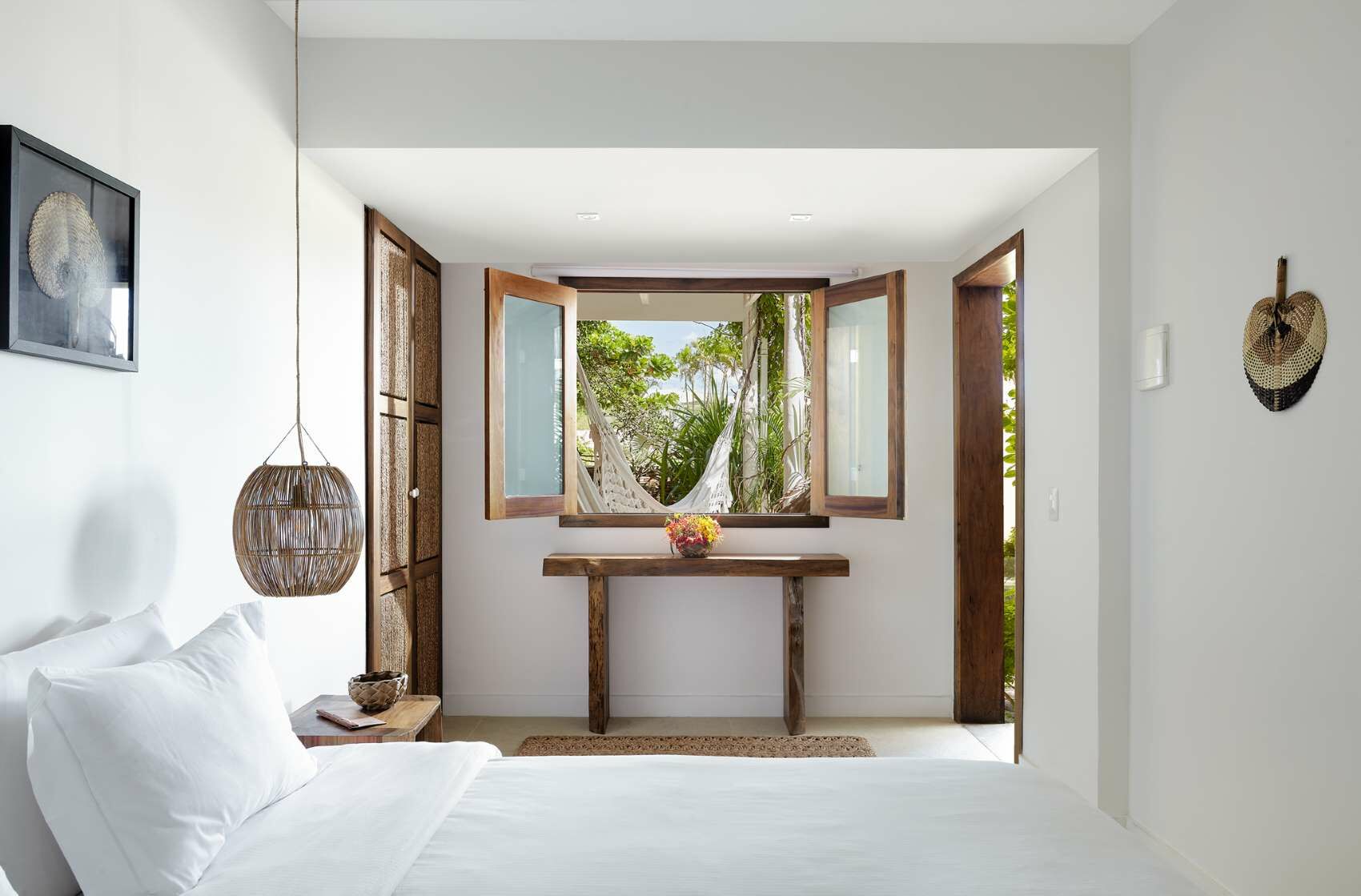 Esta suíte possui varanda privativa que proporciona uma vista privilegiada para o jardim e piscina da Villa Praia. Com decoração cuidadosa e aconchegante, é o local ideal para relaxar e desfrutar de momentos especiais em Jericoacoara.
