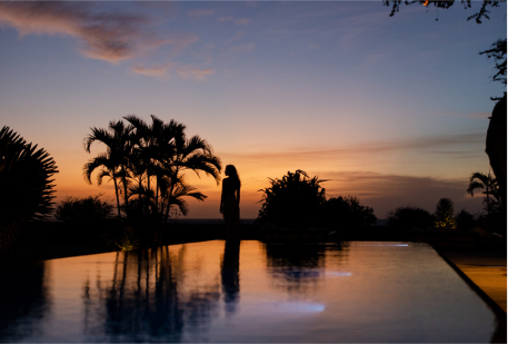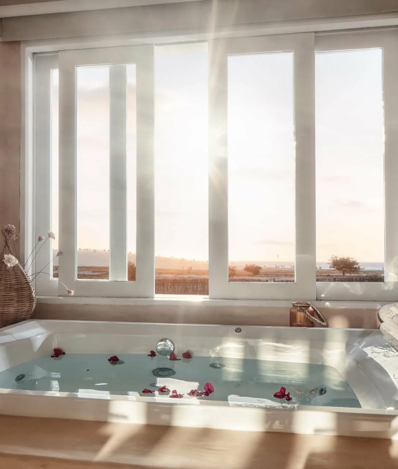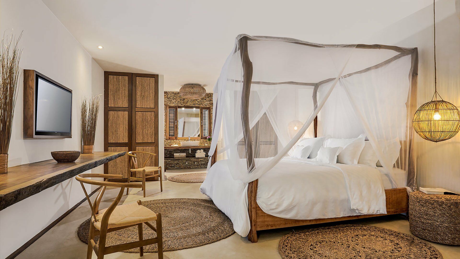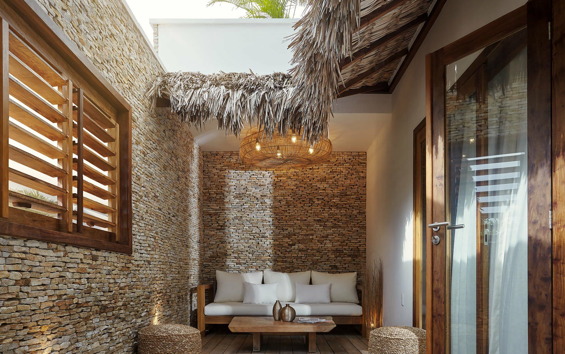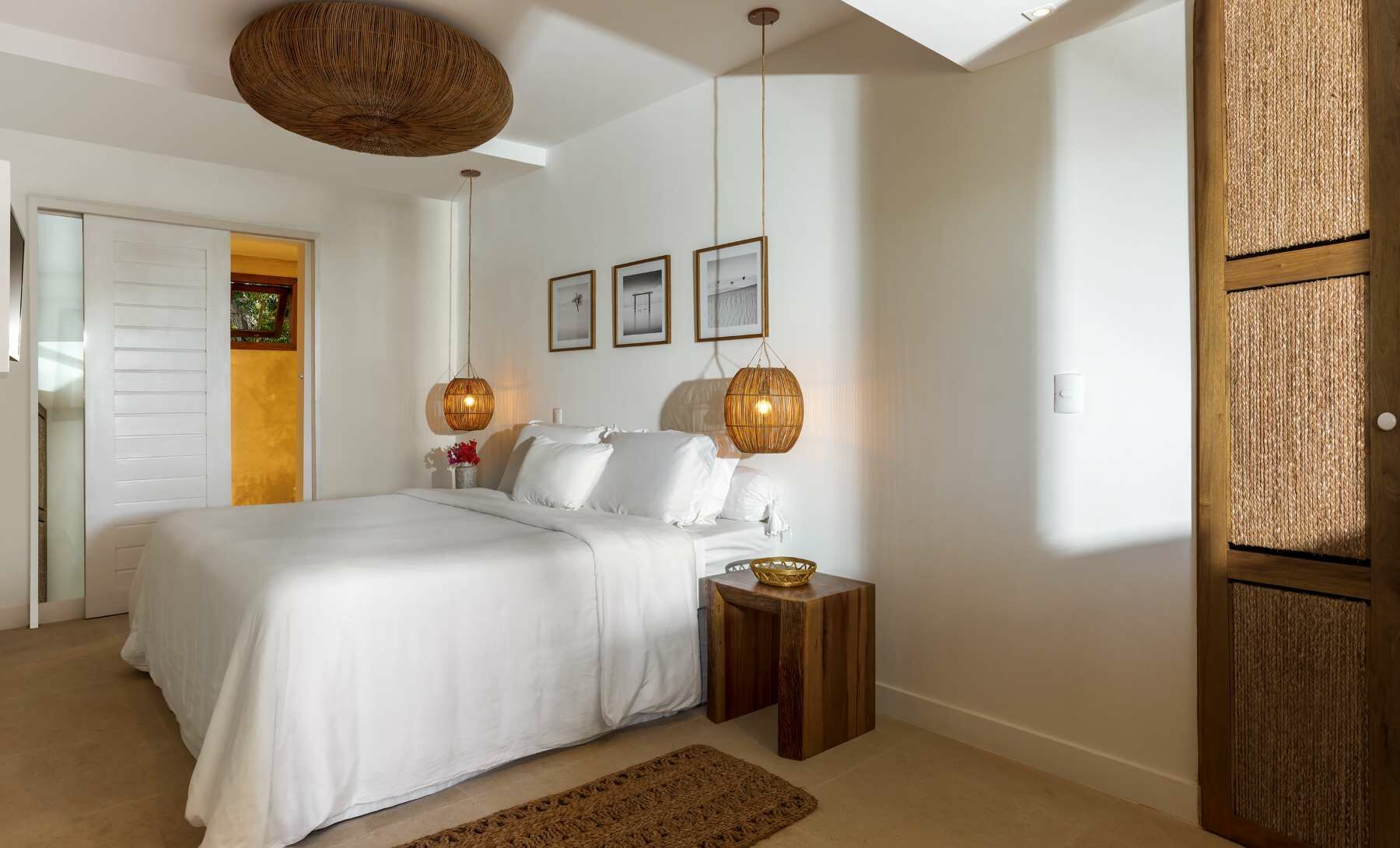 Esta elegante suíte oferece uma espaçosa área com varanda privativa. O espaço de banho é aberto para o quarto. Além disso, possui um rooftop romântico com mini piscina privativa, vista para o mar e Pôr do Sol.